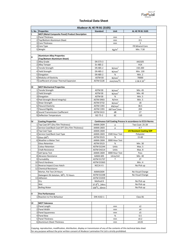 Technical Data Sheets offer detailed, standardised information about an ACP’s physical, mechanical, and performance characteristics. This includes parameters such as panel thickness, coil thickness, coating details, core properties, and application-related data, helping users understand how the material is constructed and how it is expected to perform.